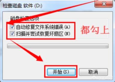 4、把“自动修复文件系统错误”和扫描并尝试恢复坏扇区”两项都打上“√” 即可,这样就完成了sd卡的修复了。