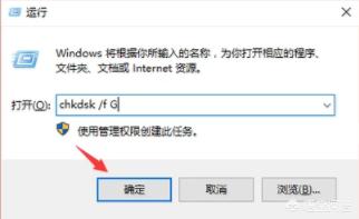 2、按住“windows”+“R”,打开运行框,并输入“chkdsk /f G”,点击确定。