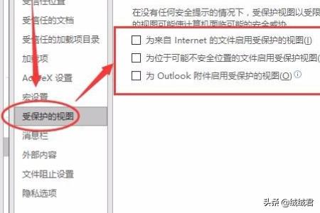 5、在信任中心设置边栏选择受保护的视图,将下图所示的三个复选框去掉勾(不勾选),点击确定按钮即可,重新打开,就可以正常使用了!如果还不行,请继续看方法二。