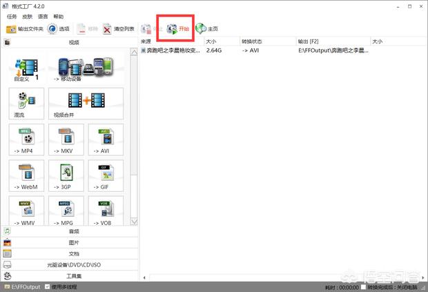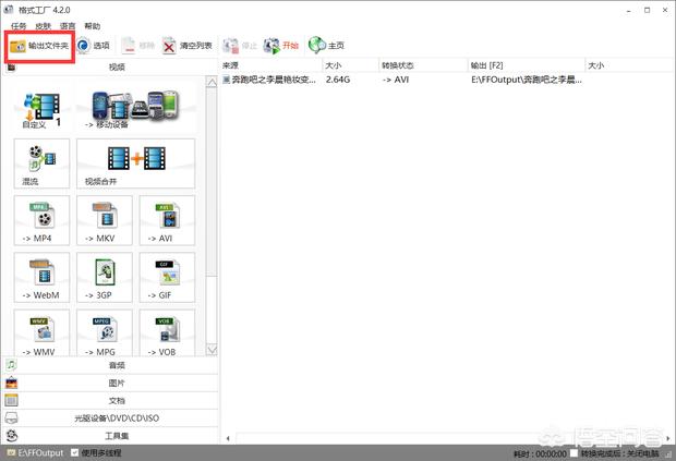 4.之后回到主界面,点击开始,就可以看见视屏已经开始转化了,这里是进度条,当进度条达到100%时转换完毕,点击输出文件夹就可以找到输出文件了。