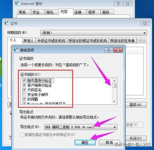 3、点击高级,再然后勾选导出证书的目的,选择好导出格式,点击确定