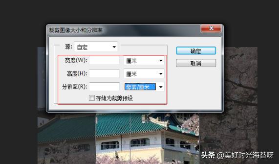 3、在后面三个输入框中依次输入裁剪的宽度、高度和分辨率,宽度和高度的单位默认和标尺的设置一致,在框中输入数值点回车,自动产生单位。