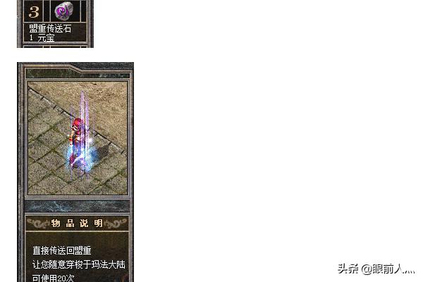 4、从比奇省去盟重的方法,购买商城道具,盟重传送石。该传送石,可以在游戏里的任意位置,直接传送至盟重土城,最为直接便利。使用次数20次。