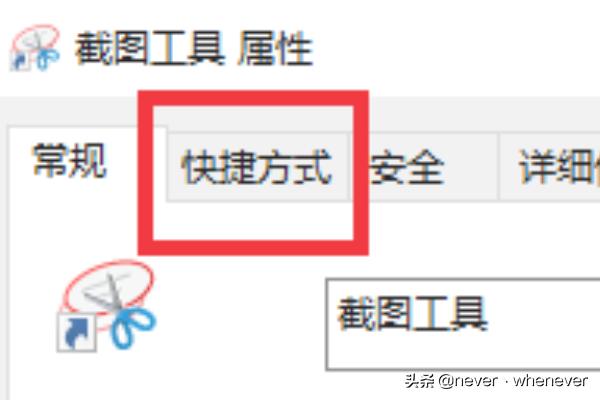 6.打开截图工具的属性窗口,在窗口点击“快捷方式”选项卡