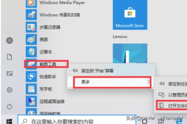 2.点击“Windows附件”找到“截图工具”的菜单项,右键点击该菜单项,在弹出菜单中依次点击“更多/打开文件位置”菜单项。
