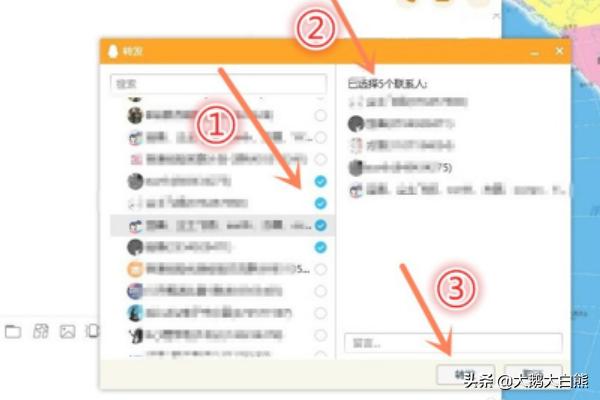 4、打开“转发”小框以后,查找你要群发的对象,勾选其右侧的“○”,如下图所示。