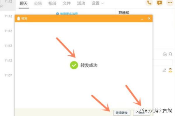 6、然后就提示“转发成功”,如果人多没发完你还可以点击右下角“继续转发”,发完以后点击“关闭”即可。