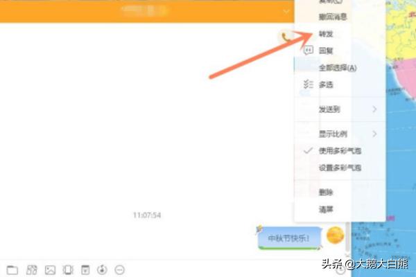3、然后右键该条信息,选择“转发”,如下图所示。(注意,如果是多条信息,就先点击“多选”选择。)