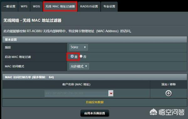 然后在路由设置界面(华硕路由通常为【无线MAC地址过滤器】选项中)添加上述设备的MAC地址。这样,未绑定的设备就无法使用网络了。