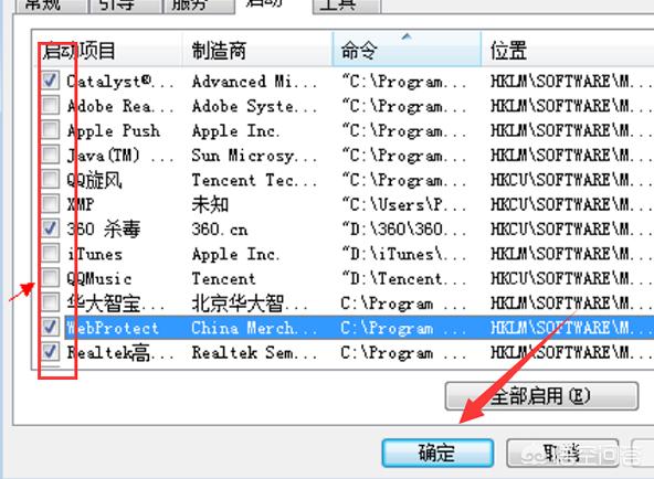 3、然后将不需要开机自动启动的软件名称前的对勾去掉,按确定即可完成设置: