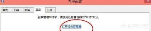 2 打开的系统配置对话框中,点击“启动”。这里是配置开机启动项和开机启动程序的功能所在。点击“打开任务管理器”。
