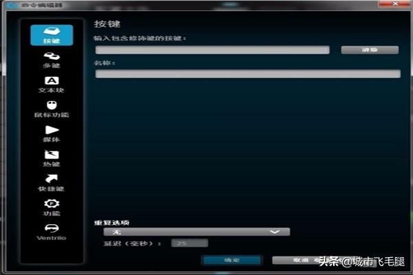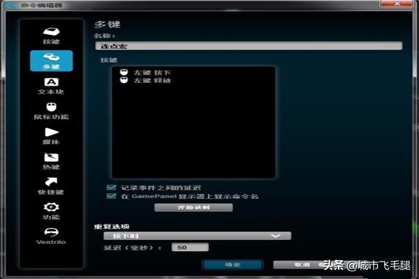 4、点击“重复选项”下拉菜单,选择“按下时”,延迟设置为50ms(也就是1秒连点20次,可以自由调节)单击确定按钮,至此,连点宏设置完毕