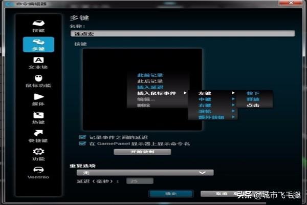 5、如何把左键替换为连点宏(不推荐使用)。由于鼠标要求必须有一个按键为左键,因此需要先在其他侧键定义一个左键,再在空出来的左键上重复上述步骤即可,定义左键过程右击任意侧键,选择编辑新命令