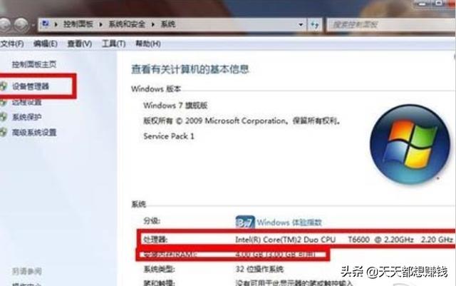 2、在属性选项卡里可看到基本的CPU及内存配置,更详细的配置资料点击选择左侧的设备管理器!