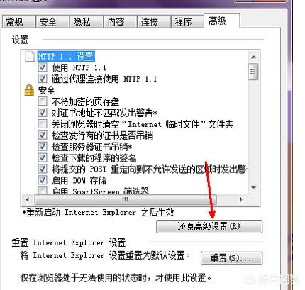 7.如果问题比较严重了,通过这种重置的方法并不能使浏览器恢复正常,那就得还原高级设置了,还原高级设置后相当于ie浏览器重新安装了一遍,这样不管是什么样的问题都可以解决,使浏览器回到最初的状态。