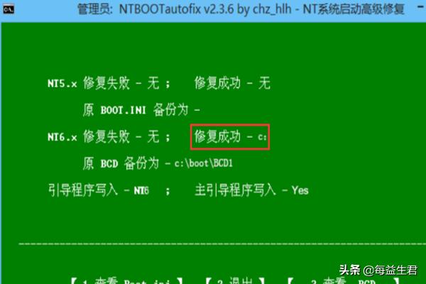4、等待系统修复完成之后,输入“2”退出系统引导自动修复工具,或者是可以输入“1”点击查看Boot.ini。