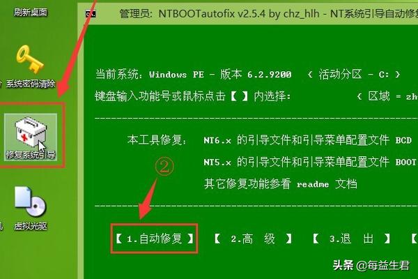 2、登录到大白菜pe系统桌面,点击打开桌面的“修复系统引导”,然后在打开的修复系统引导窗口中按“1”进入系统自动修复界面。