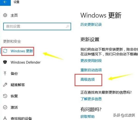 3、在更新与安全中选择windows更新选项卡,点击右侧的高级选项,如下图所示。