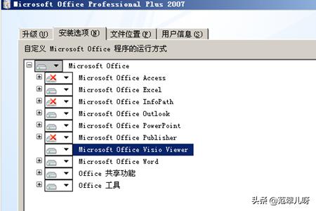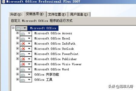 5、点安装选项--设置选择您需要的office组件,一般用户建议不要安装access一般用不上。建议安装上outlook和powerpoint可以设置为第一次使用安装。
