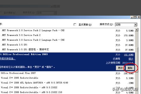 2、找到需要删除的office2003,点击删除。进入删除选项。