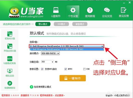2、将之前准备好的U盘插入电脑,U当家会自动识别并选为默认,如果有多个U盘可以在“选择U盘”的下拉框中选择要制作成U盘启动盘的U盘。