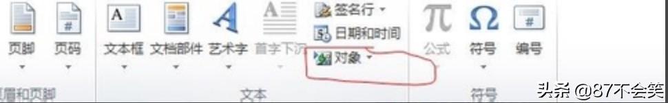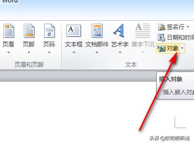 1、在“插入”“文本”中,如图点击“对象”旁边的小三角箭头,如下图所示: