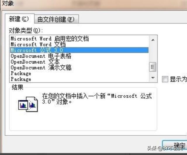 3、如果所示,选择Microsoft 公式3.0,点击确定;如下图所示。