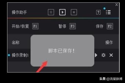 第五步:录制完成即可按F2或者箭头指的正方形按钮,即可保存脚本,会有提示已经保存,接下来可以为脚本进行改名等操作。